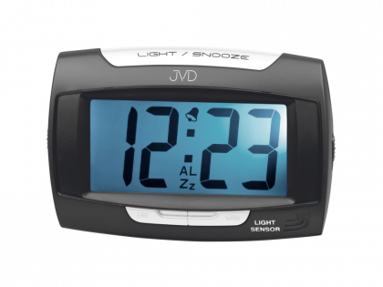 Moderní digitální budík značky JVD se světelným čidlem, který samovolně reguluje jas displeje.