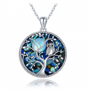 MINET Stříbrný náhrdelník strom života se sovou s černými zirkony a perletí
